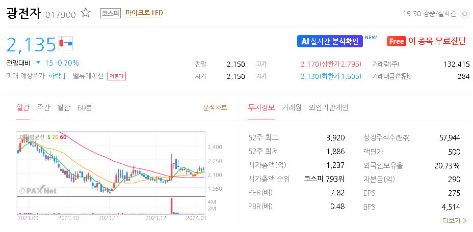 외국인 보유 비중은 20.74% 이며 장중 거래량은 132,437원 을 기록했습니다. 매출액은 976억 원을 달성했습니다. EPS는 없음원이며 광전자 주식 배당수익률은 1.74% 입니다.