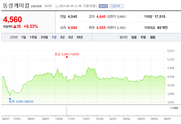 동성케미컬 현재 주가는 4,545원이며 전일 대비 -1.09원의 모습을 보이고 있습니다. 동성케미컬의 주주현황을 살펴보면 디에스티아이(외 3인)이 지분 41.64%를 소유하고 있습니다. 동성케미컬는 화학 기업으로 장중 기준으로 주가는 4,545원 입니다. 동성케미컬의 시가 총액은 2258억 원이며 발행 주식수는 2.91주 입니다.