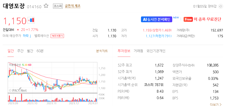 외국인 보유 비중은 0.35% 이며 장중 거래량은 152,699원 을 기록했습니다. 매출액은 2,111억 원을 달성했습니다. EPS는 없음원이며 대영포장 주식 배당수익률은 5.40% 입니다.