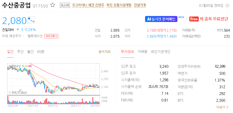 외국인 보유 비중은 1.39% 이며 장중 거래량은 111,567원 을 기록했습니다. 매출액은 1,776억 원을 달성했습니다. EPS는 없음원이며 수산중공업 주식 배당수익률은 1.51% 입니다.