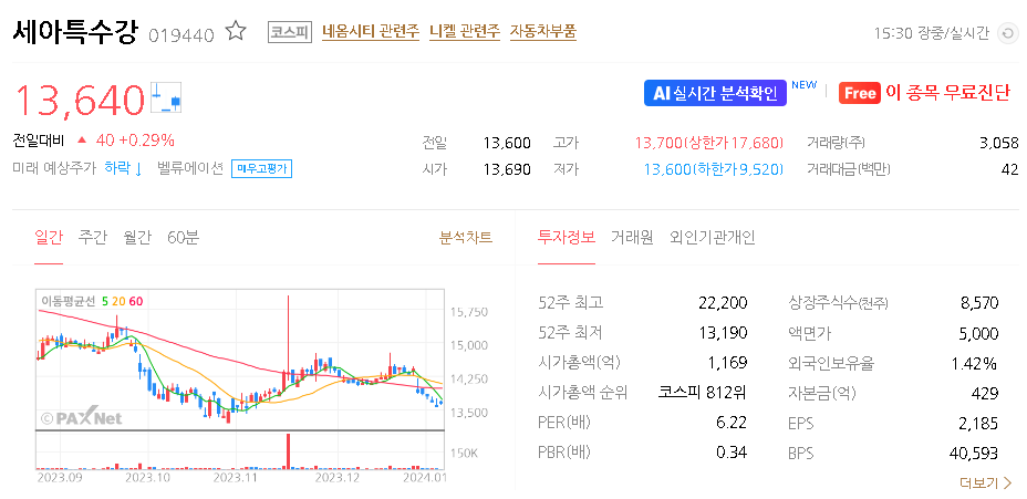 이 글에서는 세아특수강 주가 전망과 목표 주가, 기업 정보에 대해서 설명합니다. 주식 시장에서 중요한 것은 미래의 기업 가치를 예측하고 선제적으로 움직이는 것입니다. 투자할 종목을 고르기 전에 현재 기업의 현황과 데이터를 확인하는 것이 필요합니다. 세아특수강 주식의 주요 현황과 투자 정보를 확인하시고 주식 투자에 유용한 자료들을 정리하여 제공하오니 투자에 도움 받으시길 바랍니다.