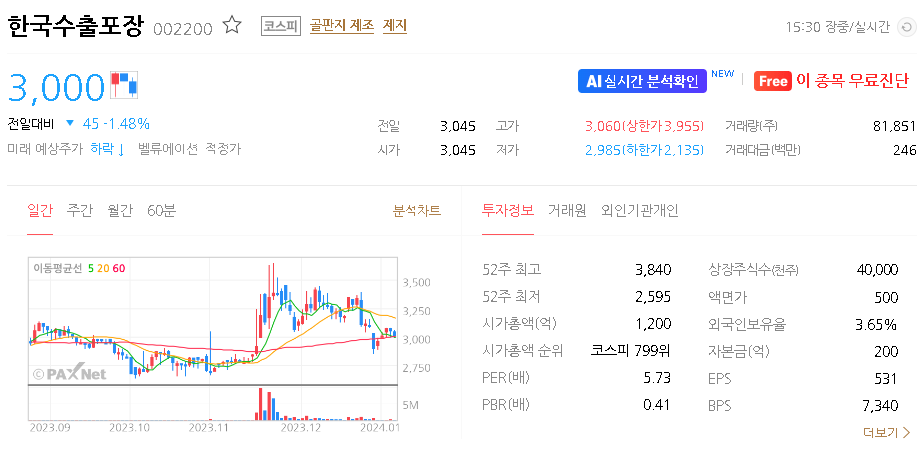 한국수출포장 현재 주가는 3,000원이며 전일 대비 -45원의 모습을 보이고 있습니다. 한국수출포장의 주주현황을 살펴보면 허정훈 주주가 전체 지분 45.56%를 소유하고 있습니다. 한국수출포장는 용기 및 포장 기업으로 장중 기준으로 주가는 3,000원 입니다. 한국수출포장의 시가 총액은 1200억 원이며 발행 주식수는 40,000,000주 입니다.