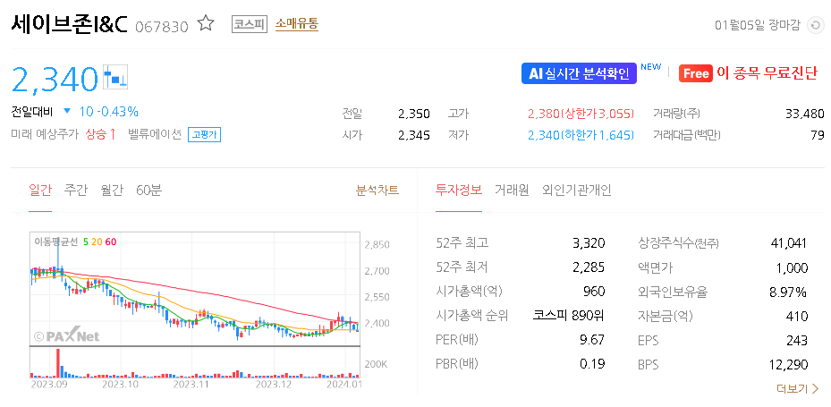 이 글에서는 세이브존I&C 주가 전망과 목표 주가, 기업 정보에 대해서 설명합니다. 주식 투자의 중심은 미래의 기업 가치를 예측하고 선제적으로 움직이는 것입니다. 투자할 종목을 고르기 전에 현재 기업 상태와 지표를 살펴야 합니다. 세이브존I&C 주식의 주요 현황과 투자 정보를 확인하시고 주식 투자에 도움이 될 수 있는 정보들을 모아 제공하오니 참고하시면 도움이 될 것입니다.
