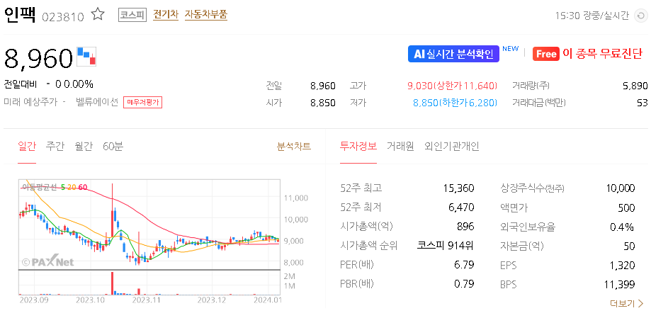 외국인 보유 비중은 0.39% 이며 장중 거래량은 5,890원 을 기록했습니다. 매출액은 4,054억 원을 달성했습니다. EPS는 없음원이며 인팩 주식 배당수익률은 2.74% 입니다.