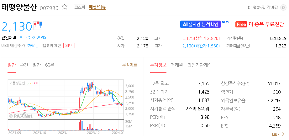 이 글에서는 태평양물산 주가 전망과 목표 주가, 기업 정보에 대해서 설명합니다. 주식 시장에서 중요한 것은 미래의 기업 가치를 예측하고 선제적으로 움직이는 것입니다. 투자 대상을 선택하기 전에 현재 기업의 현황과 데이터를 확인하는 것이 필요합니다. 태평양물산 주식의 주요 현황과 투자 정보를 확인하시고 주식 투자에 유용한 자료들을 정리하여 제공하오니 효율적인 투자를 해보세요.