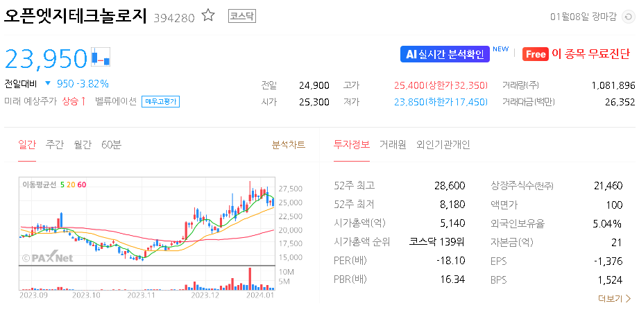오픈엣지테크놀로지의 시가 총액은 5343억 원이며 발행 주식수는 21,459,810주 입니다. 외국인 보유 비중은 5.31% 이며 장중 거래량은 1,201,162원 을 기록했습니다. 매출액은 58억 원을 달성했습니다. EPS는 -559원이며 오픈엣지테크놀로지 주식 배당수익률은 124,438% 입니다.