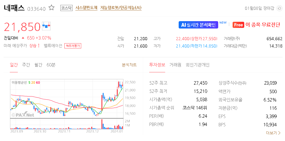 외국인 보유 비중은 6.52% 이며 장중 거래량은 350,390원 을 기록했습니다. 매출액은 3,612억 원을 달성했습니다. EPS는 없음원이며 네패스 주식 배당수익률은 % 입니다.
