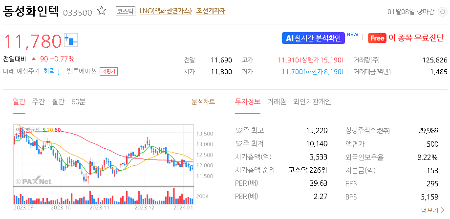 동성화인텍 현재 주가는 11,690원이며 전일 대비 -220원의 모습을 보이고 있습니다. 동성화인텍의 주주현황을 살펴보면 동성케미컬 주주가 전체 지분 37.94%를 소유하고 있습니다. 동성화인텍는 화학 기업으로 장중 기준으로 주가는 11,690원 입니다. 동성화인텍의 시가 총액은 3506억 원이며 발행 주식수는 29,989,494주 입니다.