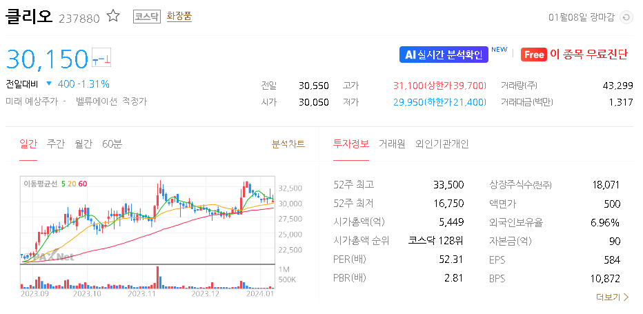 외국인 보유 비중은 6.96% 이며 장중 거래량은 92,947원 을 기록했습니다. 매출액은 2,409억 원을 달성했습니다. EPS는 1,508원이며 클리오 주식 배당수익률은 1.23% 입니다.