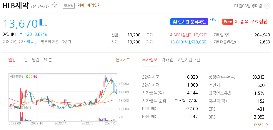 이 글에서는 HLB제약 주가 전망과 목표 주가, 기업 정보에 대해서 설명합니다. 주식 시장에서 핵심은 미래의 기업 가치를 예측하고 선제적으로 움직이는 것입니다. 투자할 종목을 선택하기 전에 현재 기업의 현황과 데이터를 확인하는 것이 필요합니다. HLB제약 주식의 주요 현황과 투자 정보를 확인하시고 주식 투자에 유용한 정보들을 모아두었으니 투자 결정에 도움을 받으실 수 있을 것입니다.