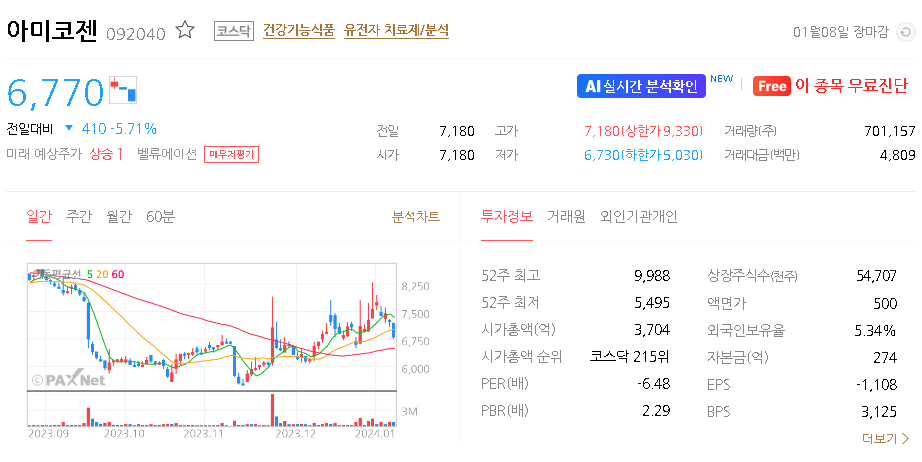 외국인 보유 비중은 5.35% 이며 장중 거래량은 812,092원 을 기록했습니다. 매출액은 1,209억 원을 달성했습니다. EPS는 없음원이며 아미코젠 주식 배당수익률은 4,254,250% 입니다.