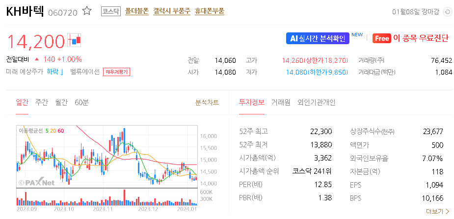 KH바텍는 휴대폰 및 관련부품 기업입니다. 대표자는 남광희 이며 설립일은 1992/11/23, 주식 상장일은 2002/05/21입니다. 전체 종업원 수는97명 이고 본사 주소는 경북 구미시 1공단로10길 53-12입니다.