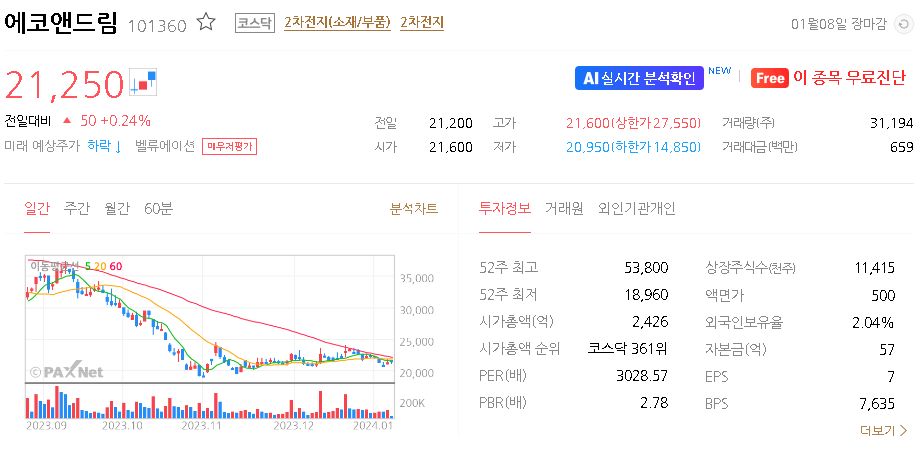 외국인 보유 비중은 2.06% 이며 장중 거래량은 94,741원 을 기록했습니다. 매출액은 366억 원을 달성했습니다. EPS는 없음원이며 에코앤드림 주식 배당수익률은 0.96% 입니다.