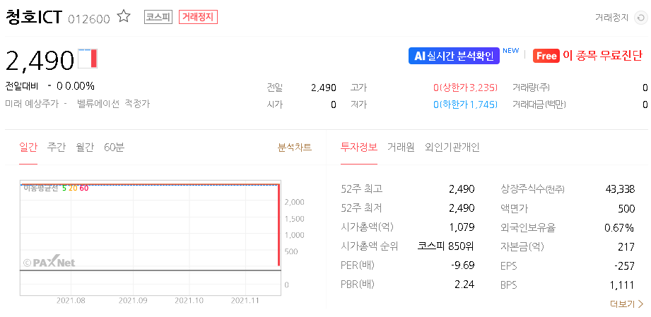 외국인 보유 비중은 0.67% 이며 장중 거래량은 0원 을 기록했습니다. 매출액은 138억 원을 달성했습니다. EPS는 없음원이며 청호ICT 주식 배당수익률은 % 입니다.