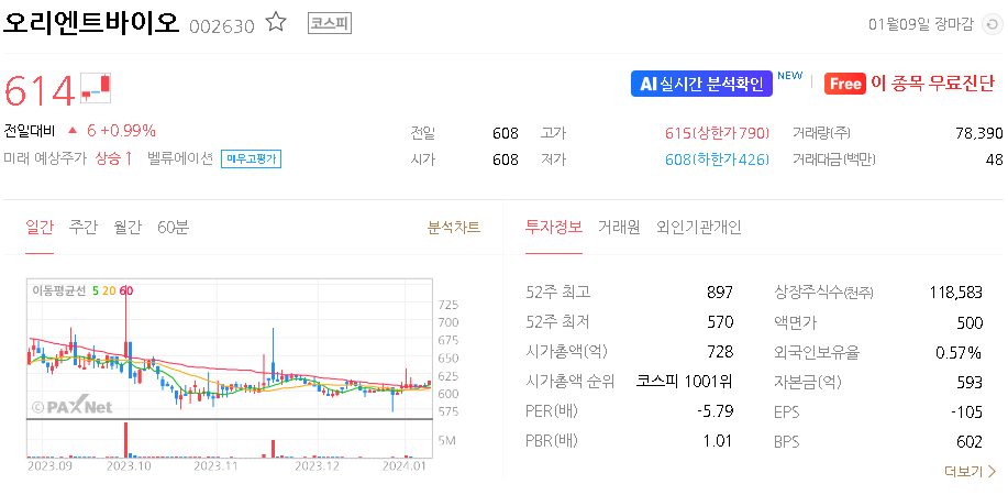 외국인 보유 비중은 0.57% 이며 장중 거래량은 122,783원 을 기록했습니다. 매출액은 134억 원을 달성했습니다. EPS는 없음원이며 오리엔트바이오 주식 배당수익률은 % 입니다.