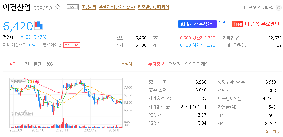 외국인 보유 비중은 4.25% 이며 장중 거래량은 6,552원 을 기록했습니다. 매출액은 2,242억 원을 달성했습니다. EPS는 없음원이며 이건산업 주식 배당수익률은 8.22% 입니다.
