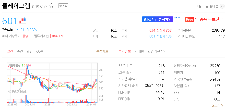 외국인 보유 비중은 0.91% 이며 장중 거래량은 491,736원 을 기록했습니다. 매출액은 1,543억 원을 달성했습니다. EPS는 없음원이며 플레이그램 주식 배당수익률은 % 입니다.