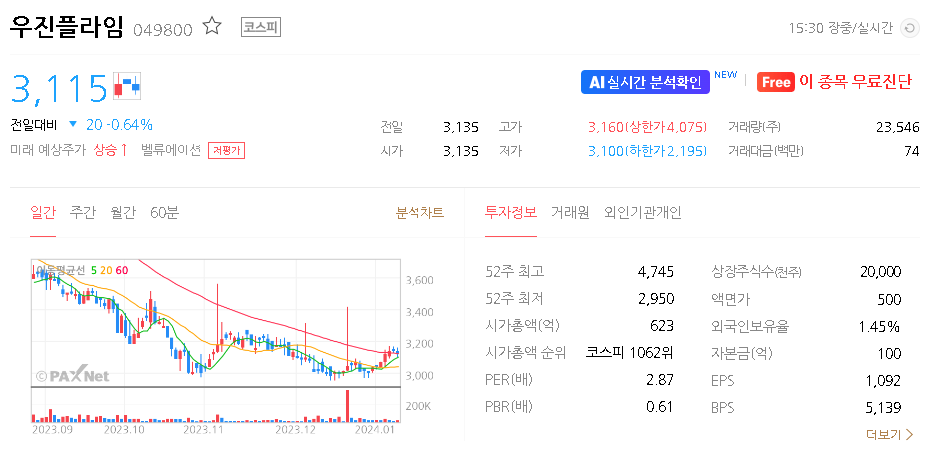 외국인 보유 비중은 1.47% 이며 장중 거래량은 24,659원 을 기록했습니다. 매출액은 1,579억 원을 달성했습니다. EPS는 없음원이며 우진플라임 주식 배당수익률은 22.78% 입니다.