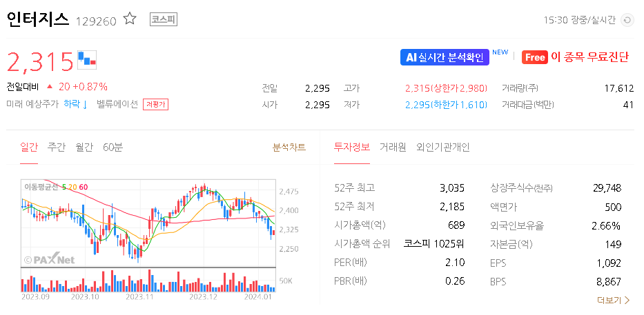 외국인 보유 비중은 2.67% 이며 장중 거래량은 30,092원 을 기록했습니다. 매출액은 4,572억 원을 달성했습니다. EPS는 없음원이며 인터지스 주식 배당수익률은 3.29% 입니다.