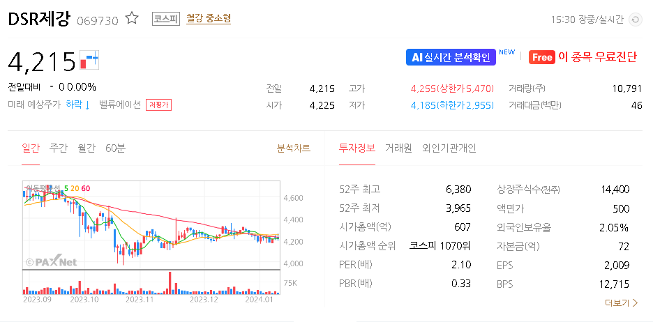 외국인 보유 비중은 2.07% 이며 장중 거래량은 7,263원 을 기록했습니다. 매출액은 1,578억 원을 달성했습니다. EPS는 없음원이며 DSR제강 주식 배당수익률은 5.40% 입니다.