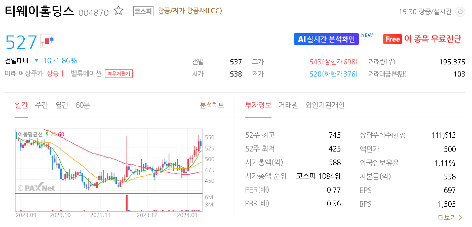 외국인 보유 비중은 1.05% 이며 장중 거래량은 366,183원 을 기록했습니다. 매출액은 68억 원을 달성했습니다. EPS는 없음원이며 티웨이홀딩스 주식 배당수익률은 1.87% 입니다.