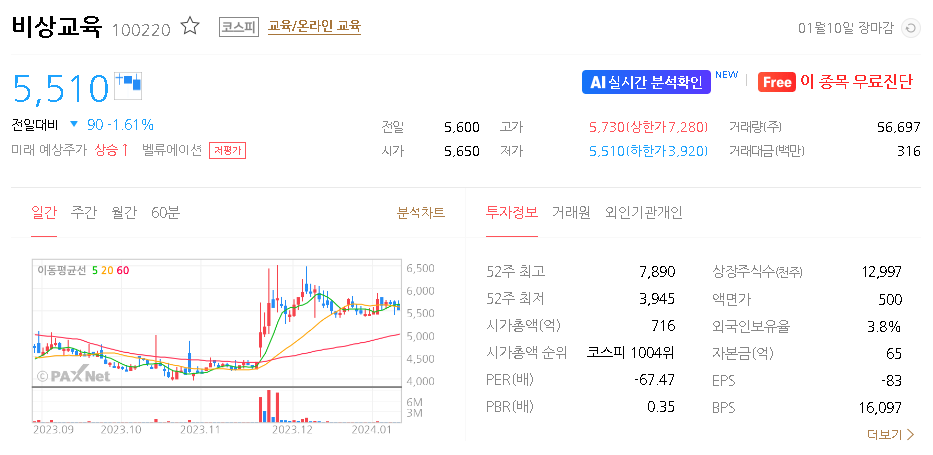 외국인 보유 비중은 3.71% 이며 장중 거래량은 63,313원 을 기록했습니다. 매출액은 1,641억 원을 달성했습니다. EPS는 없음원이며 비상교육 주식 배당수익률은 5.40% 입니다.