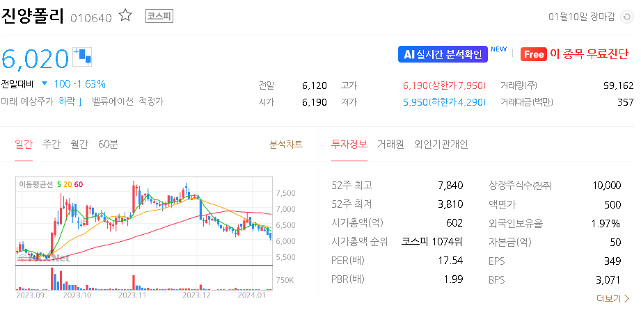 외국인 보유 비중은 2.00% 이며 장중 거래량은 18,545원 을 기록했습니다. 매출액은 409억 원을 달성했습니다. EPS는 없음원이며 진양폴리 주식 배당수익률은 135% 입니다.