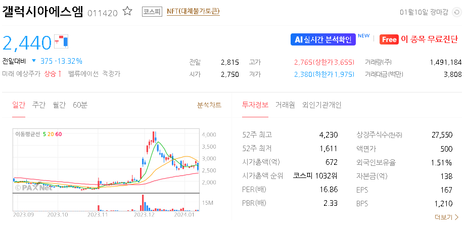 외국인 보유 비중은 1.55% 이며 장중 거래량은 356,483원 을 기록했습니다. 매출액은 222억 원을 달성했습니다. EPS는 없음원이며 갤럭시아에스엠 주식 배당수익률은 1.69% 입니다.