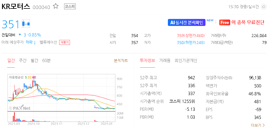 외국인 보유 비중은 46.76% 이며 장중 거래량은 464,629원 을 기록했습니다. 매출액은 608억 원을 달성했습니다. EPS는 없음원이며 KR모터스 주식 배당수익률은 -27% 입니다.
