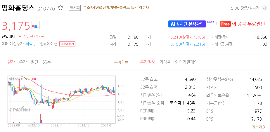 외국인 보유 비중은 15.27% 이며 장중 거래량은 8,381원 을 기록했습니다. 매출액은 5,927억 원을 달성했습니다. EPS는 없음원이며 평화홀딩스 주식 배당수익률은 6,277% 입니다.