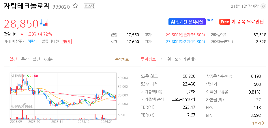 외국인 보유 비중은 0.81% 이며 장중 거래량은 31,435원 을 기록했습니다. 매출액은 65억 원을 달성했습니다. EPS는 없음원이며 자람테크놀로지 주식 배당수익률은 12.89% 입니다.