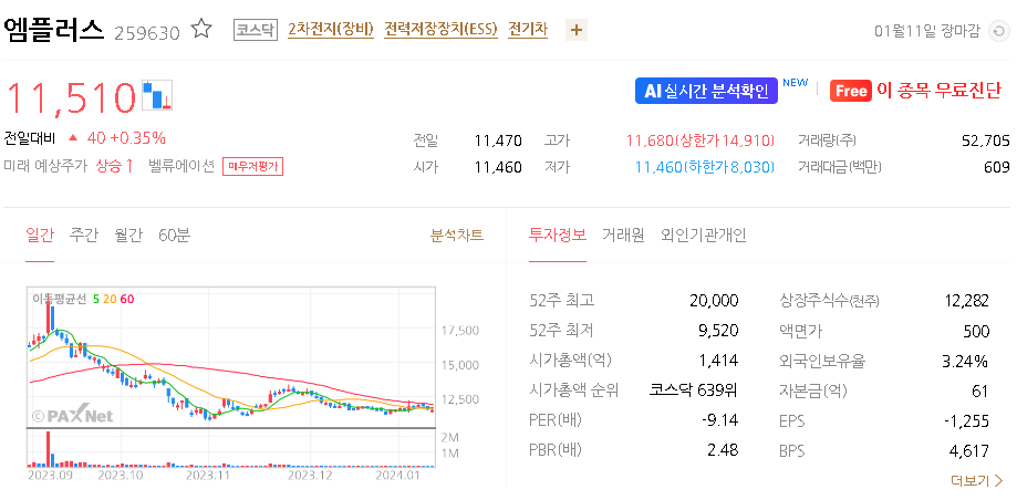외국인 보유 비중은 3.26% 이며 장중 거래량은 55,612원 을 기록했습니다. 매출액은 1,958억 원을 달성했습니다. EPS는 1,474원이며 엠플러스 주식 배당수익률은 3,114% 입니다.