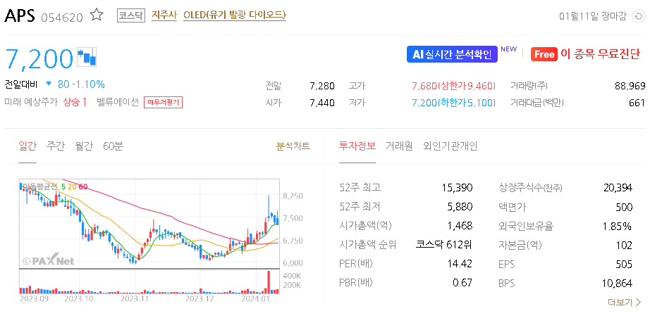 APS 현재 주가는 7,280원이며 전일 대비 -210원의 모습을 보이고 있습니다. APS의 주주현황을 살펴보면 정기로 주주가 전체 지분 31.33%를 소유하고 있습니다. APS는 IT 서비스 기업으로 장중 기준으로 주가는 7,280원 입니다. APS의 시가 총액은 1468억 원이며 발행 주식수는 20,394,221주 입니다.