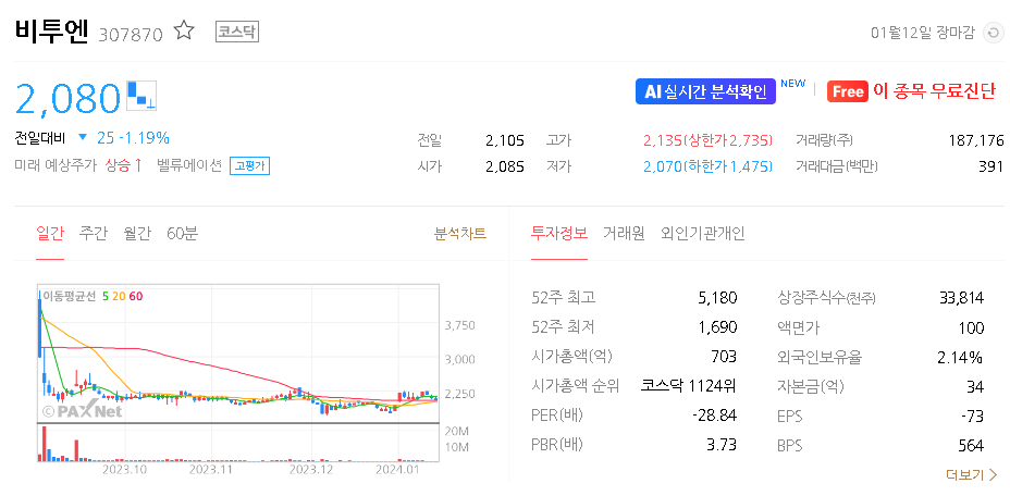외국인 보유 비중은 1.97% 이며 장중 거래량은 175,692원 을 기록했습니다. 매출액은 216억 원을 달성했습니다. EPS는 없음원이며 비투엔 주식 배당수익률은 % 입니다.
