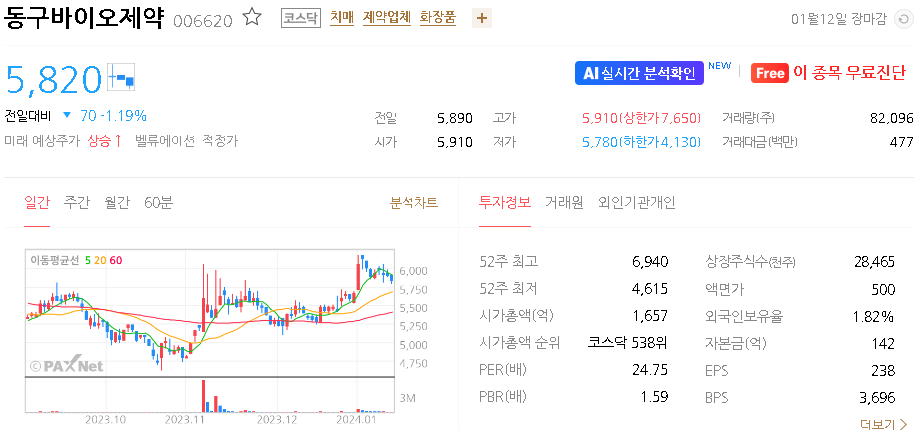 이 글에서는 동구바이오제약 주가 전망과 목표 주가, 기업 정보에 대해서 설명합니다. 주식 거래에서 중요한 부분은 현재 기업 가치보다는 미래의 기업 가치를 예측하고 먼저 행동하는 것입니다. 투자할 종목을 고르기 전에 현재 기업의 상황과 지표를 살펴보는 것이 중요합니다. 동구바이오제약 주식의 주요 현황과 투자 정보를 확인하시고 주식 투자에 도움을 줄 자료들을 모아 두었으니 투자에 도움을 받으시길 바랍니다.