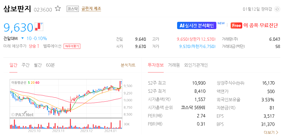 외국인 보유 비중은 3.52% 이며 장중 거래량은 7,823원 을 기록했습니다. 매출액은 4,140억 원을 달성했습니다. EPS는 없음원이며 삼보판지 주식 배당수익률은 % 입니다.
