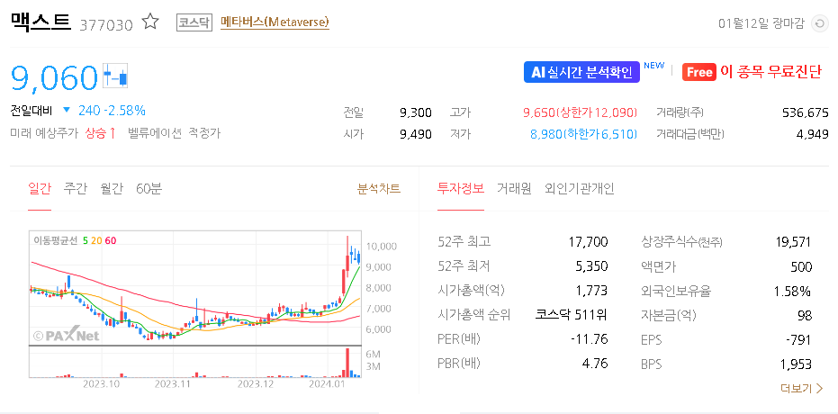 외국인 보유 비중은 1.43% 이며 장중 거래량은 1,719,880원 을 기록했습니다. 매출액은 9억 원을 달성했습니다. EPS는 없음원이며 맥스트 주식 배당수익률은 52.10% 입니다.