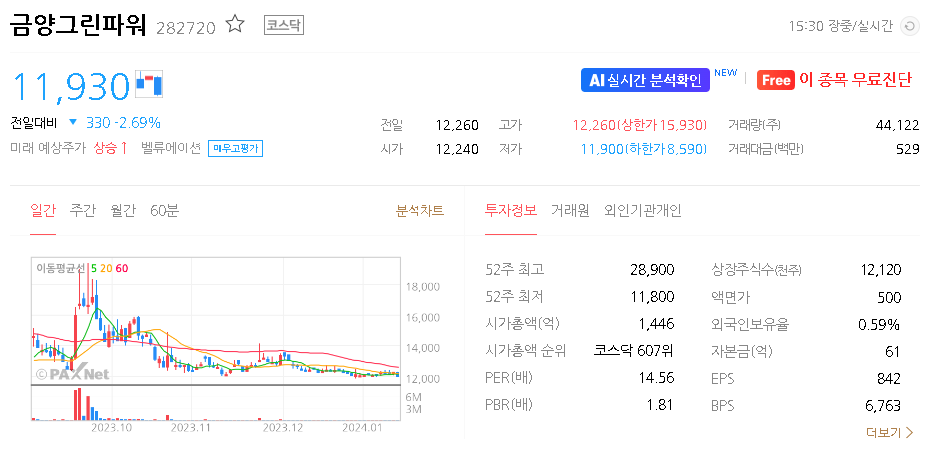 외국인 보유 비중은 0.38% 이며 장중 거래량은 32,465원 을 기록했습니다. 매출액은 1,611억 원을 달성했습니다. EPS는 없음원이며 금양그린파워 주식 배당수익률은 -50% 입니다.