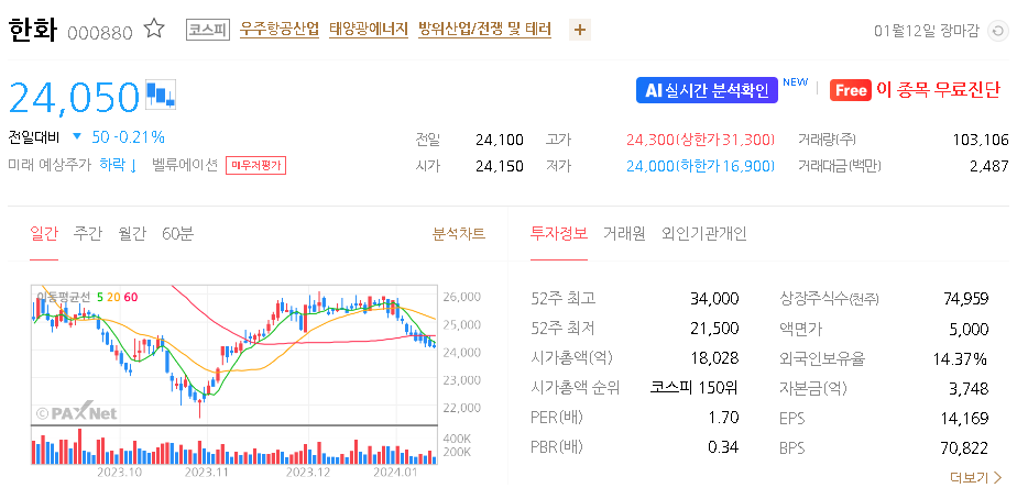 외국인 보유 비중은 14.37% 이며 장중 거래량은 203,482원 을 기록했습니다. 매출액은 386,588억 원을 달성했습니다. EPS는 10,015원이며 한화 주식 배당수익률은 2.92% 입니다.