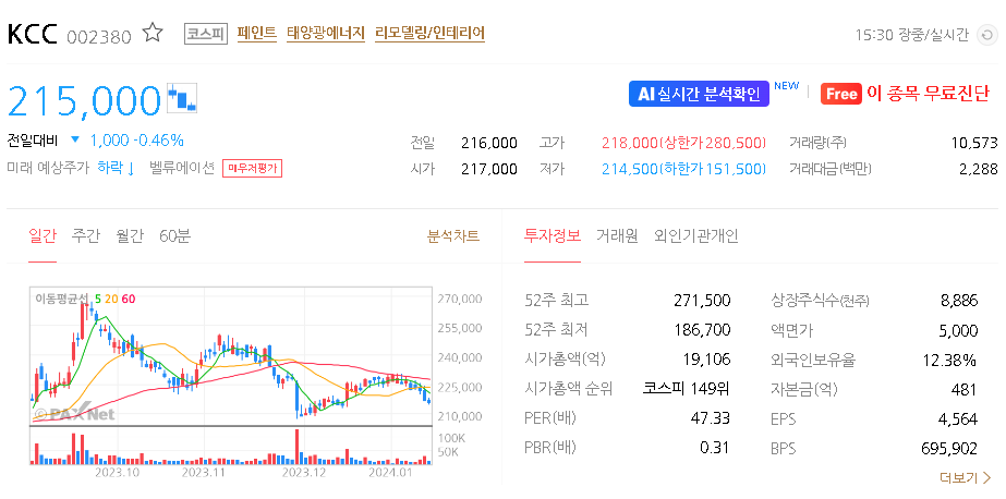 이 글에서는 KCC 주가 전망과 목표 주가, 기업 정보에 대해서 설명합니다. 주식 투자의 중심은 미래의 기업 가치를 예측하고 선제적으로 움직이는 것입니다. 투자할 종목을 고르기 전에 현재 기업 상태와 지표를 살펴야 합니다. KCC 주식의 주요 현황과 투자 정보를 확인하시고 주식 투자에 도움이 될 만한 정보들을 모아 놓았으니 투자 시 참고하시기 바랍니다.