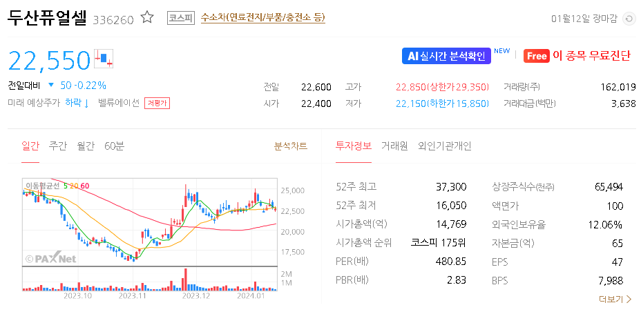 외국인 보유 비중은 12.06% 이며 장중 거래량은 287,537원 을 기록했습니다. 매출액은 1,447억 원을 달성했습니다. EPS는 78원이며 두산퓨얼셀 주식 배당수익률은 2.22% 입니다.