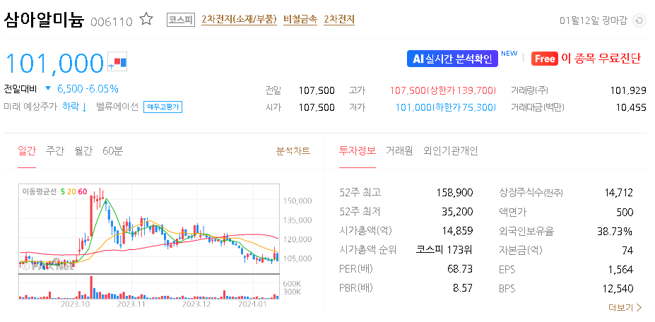 [주가동향] 삼아알미늄, 반년새 200% 상승... 기관 ...
