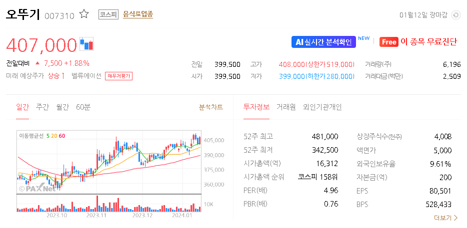 이 글에서는 오뚜기 주가 전망과 목표 주가, 기업 정보에 대해서 설명합니다. 주식 투자의 핵심은 현재의 기업 가치보다는 미래의 가치를 예측하며 먼저 대응하는 것입니다. 투자 대상을 결정하기 위해 먼저 현재 기업 상태와 수치를 검토해야 합니다. 오뚜기 주식의 주요 현황과 투자 정보를 확인하시고 주식 투자에 도움을 줄 자료들을 모아 두었으니 투자 결정에 도움을 받으시길 바랍니다.
