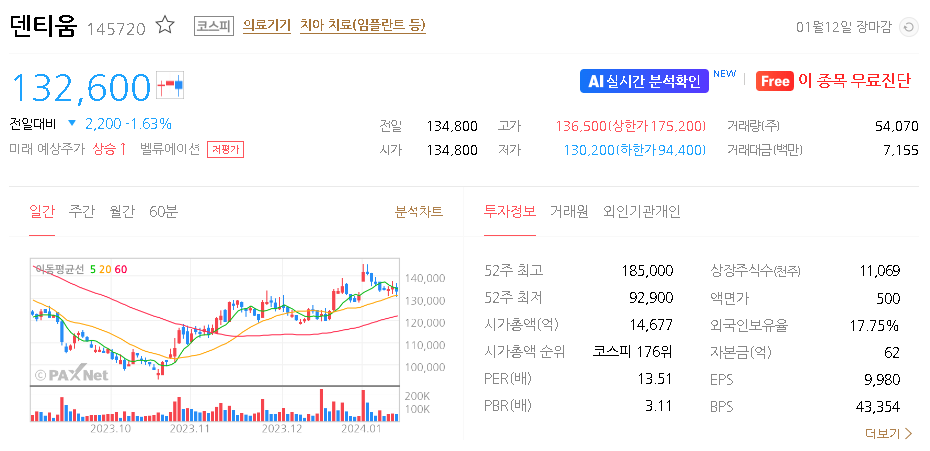이 글에서는 덴티움 주가 전망과 목표 주가, 기업 정보에 대해서 설명합니다. 주식 거래에서 주목해야 할 점은 미래의 기업 가치를 예측하고 먼저 움직이는 것입니다. 투자 대상을 선택하기 전에 현재 기업 상황과 지표를 살펴보아야 합니다. 덴티움 주식의 주요 현황과 투자 정보를 확인하시고 주식 투자에 도움을 줄 자료들을 모아 두었으니 투자 결정에 도움을 받으시길 바랍니다.