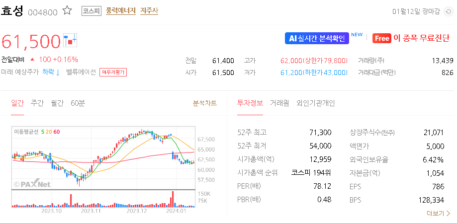 효성 현재 주가는 61,400원이며 전일 대비 -200원의 모습을 보이고 있습니다. 효성의 주주현황을 살펴보면 조현준 주주가 전체 지분 56.10%를 소유하고 있습니다. 효성는 복합 산업 기업으로 장중 기준으로 주가는 61,400원 입니다. 효성의 시가 총액은 1조2959억 원이며 발행 주식수는 21,071,025주 입니다.