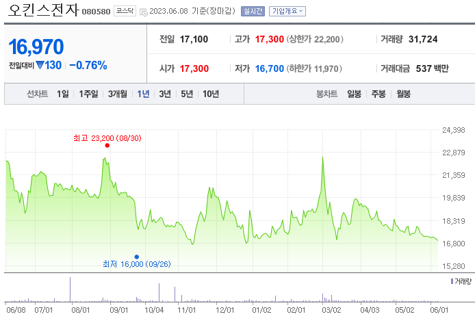 외국인 보유 비중은 20,309%이며 장중 거래량은 17,679,298를 기록했습니다. 매출액은 123억 원, 영업이익은 26억 원을 달성했습니다. EPS는 없음원이며 오킨스전자 주식 배당수익률은 %입니다.