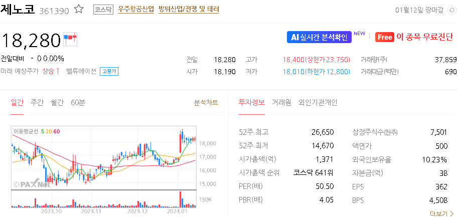 제노코 현재 주가는 18,280원이며 전일 대비 -7.63원의 모습을 보이고 있습니다. 제노코의 주주현황을 살펴보면 유태삼 주주가 전체 지분 42.08%를 소유하고 있습니다. 제노코는 통신장비 기업으로 장중 기준으로 주가는 18,280원 입니다. 제노코의 시가 총액은 1371억 원이며 발행 주식수는 7,500,789주 입니다.