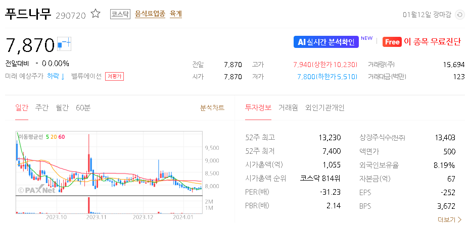 외국인 보유 비중은 8.18% 이며 장중 거래량은 15,752원 을 기록했습니다. 매출액은 1,560억 원을 달성했습니다. EPS는 없음원이며 푸드나무 주식 배당수익률은 % 입니다.