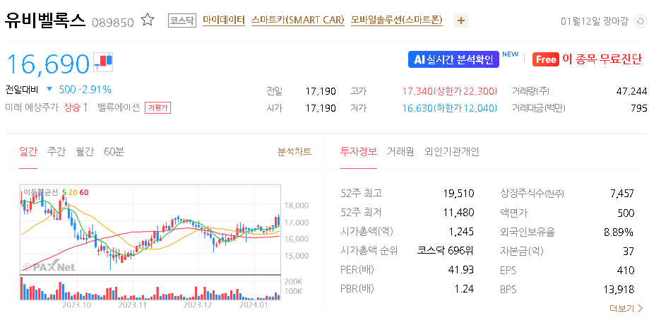 이 글에서는 유비벨록스 주가 전망과 목표 주가, 기업 정보에 대해서 설명합니다. 주식 투자의 중심은 미래의 기업 가치를 예측하고 선제적으로 움직이는 것입니다. 투자할 종목을 고르기 전에 현재 기업 상태와 지표를 살펴야 합니다. 유비벨록스 주식의 주요 현황과 투자 정보를 확인하시고 주식 투자에 도움이 되는 자료들을 정리하여 제공하니 투자 시 참고하시길 추천합니다.