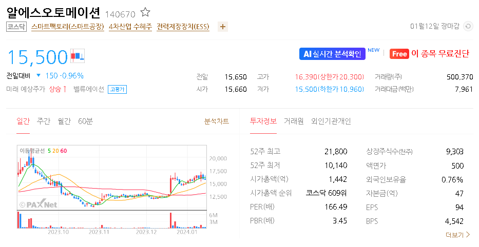 알에스오토메이션의 시가 총액은 1442억 원이며 발행 주식수는 9,303,140주 입니다. 외국인 보유 비중은 0.70% 이며 장중 거래량은 505,839원 을 기록했습니다. 매출액은 615억 원을 달성했습니다. EPS는 없음원이며 알에스오토메이션 주식 배당수익률은 -16% 입니다.